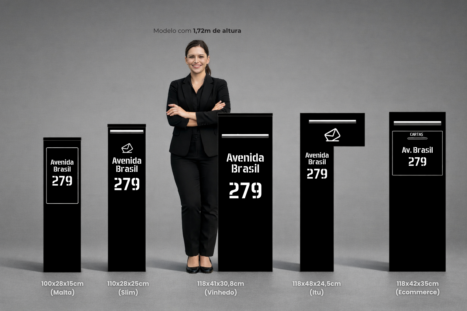 A principal diferença está nas dimensões. O funcionamento, o material e o sistema de iluminação são os mesmos dos modelos Slim e Itu. Por ser maior, o modelo Vinhedo é indicado para casas com fachadas mais amplas, oferecendo maior área para personalização e melhor visibilidade das informações.