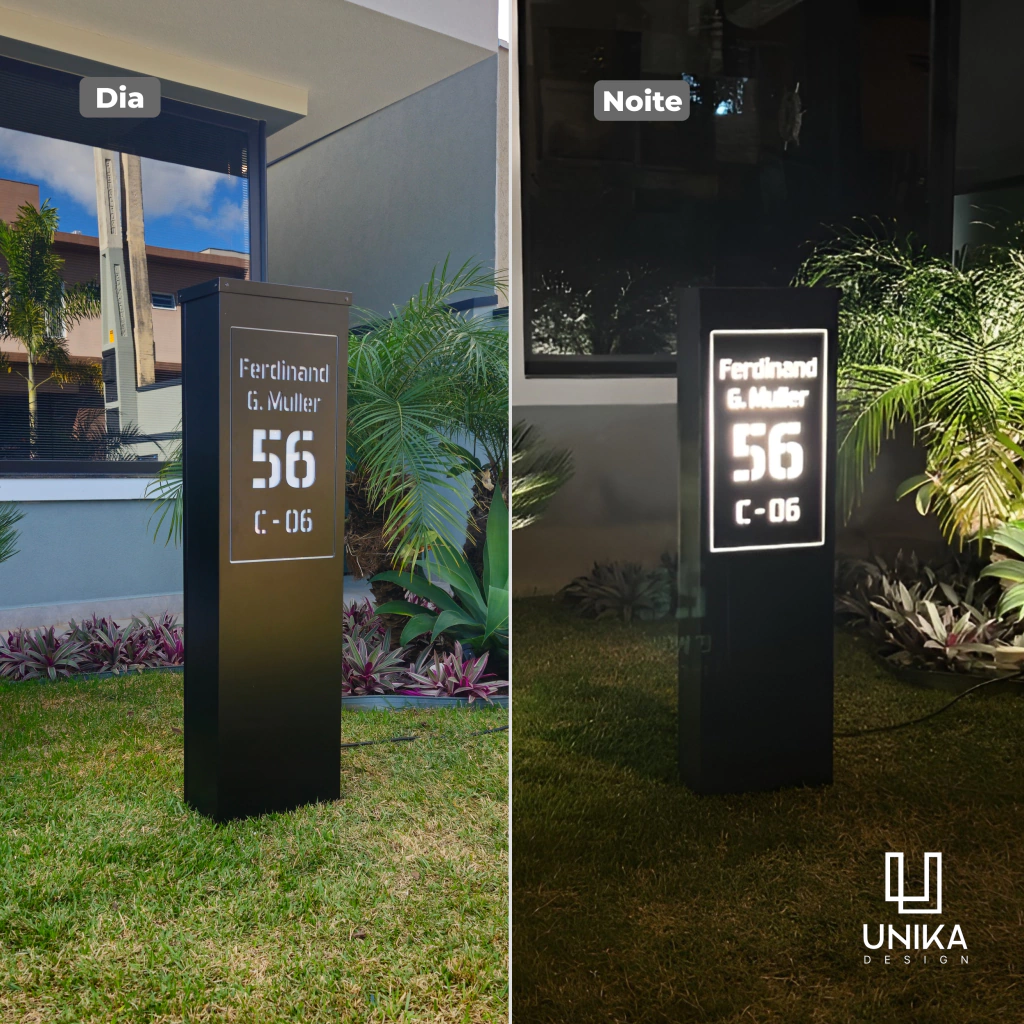 Com iluminação LED integrada, o endereço permanece visível mesmo à noite, garantindo visibilidade e valorização à sua fachada. Ideal para condomínios e residências modernas.